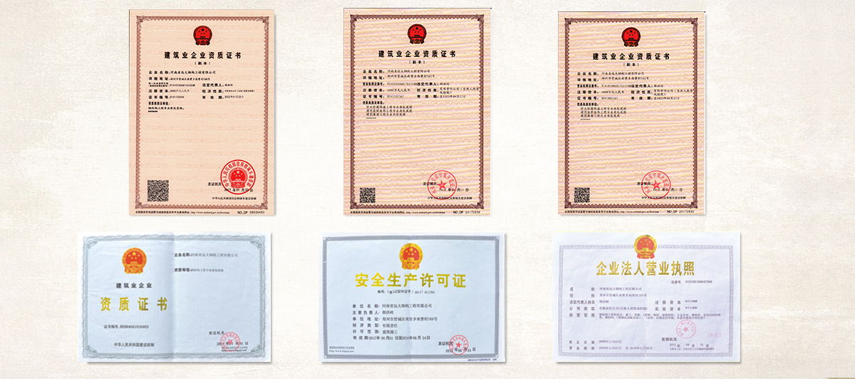 公司擁有“鋼結(jié)構(gòu)制造壹級”和“鋼結(jié)構(gòu)工程專業(yè)承包壹級”專業(yè)資質(zhì),獲得業(yè)內(nèi)認(rèn)可的各類專利及榮譽資質(zhì)證書;公司及產(chǎn)品已通過了ISO9001質(zhì)量管理體系認(rèn)證和省級檢測、鑒定,安全耐用。